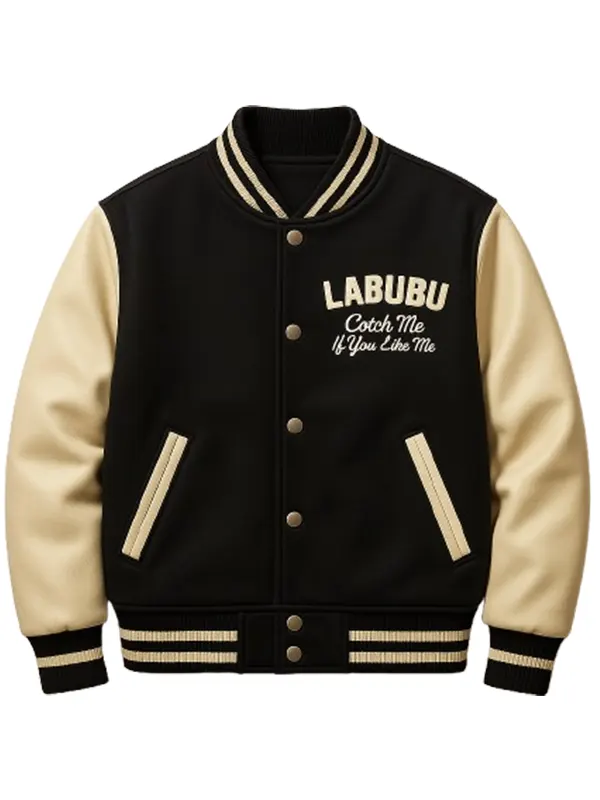 This Labubu Satin Black Bomber Varsity Jacket features a sleek satin exterior, soft inner lining, and bold black-Cream detailing for a standout look. The embroidered Labubu patch adds playful charm, while the rib-knit collar, cuffs, and hem ensure a perfect fit. Ideal for everyday wear, it blends comfort, style, and uniqueness effortlessly.