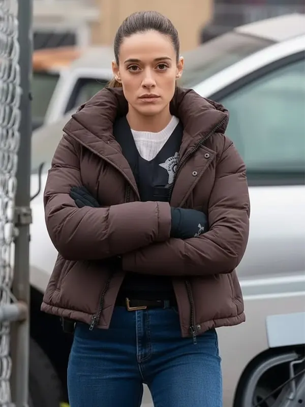 Styled by Kim Burgess in the Chicago P.D. series, this dark brown puffer jacket features parachute fabric, soft viscose lining, full length sleeves, rounded cuffs, hooded style collar, and zipper and snap button front, including two outside pockets and one inside pocket. It complements winter fashion.