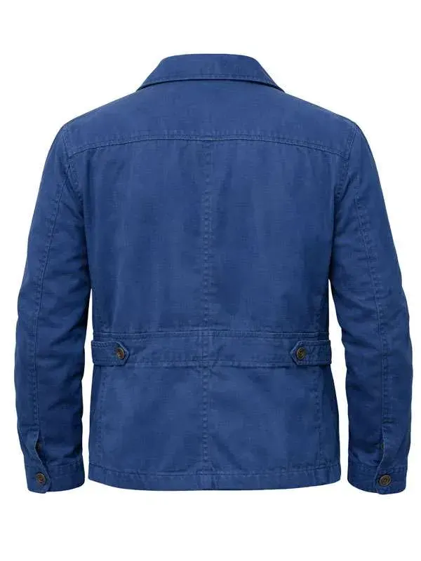 Mervin Wilson Blue Jacket from the Death In Paradise series is crafted using cotton fabric with soft viscose lining, full length sleeves, buttoned cuffs, shirt style collar, and button closure, featuring three outside pockets and two inside pockets. Suited for casual outings, city adventures, and refined everyday fashion.