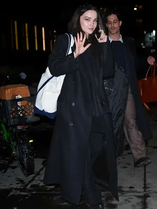 This sleek black coat worn by Dove Cameron during her NYC appearance is made using wool fabric, smooth viscose lining, full length sleeves, buttoned cuff, lapel style collar, and button and belted front with two outside pockets and two inside pockets. It enhances winter styling and graceful fashion appearances.