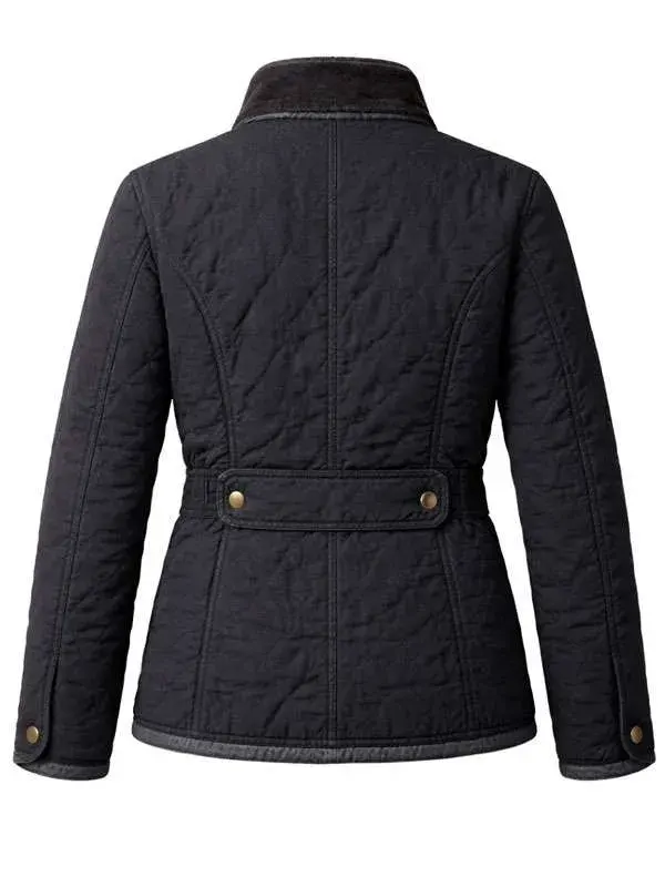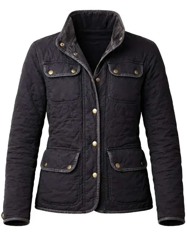 Worn by Fleur Geffrier in the Drops of God series, this black quilted jacket features polyester fabric, soft viscose lining, full length sleeves, buttoned cuff, stand up collar, and button closure, including four outside pockets and two inside pockets. It complements casual gatherings.