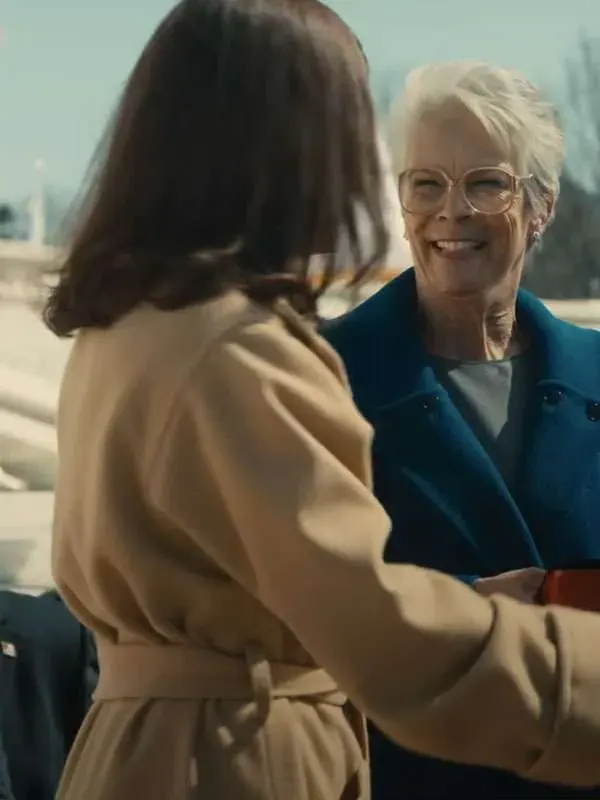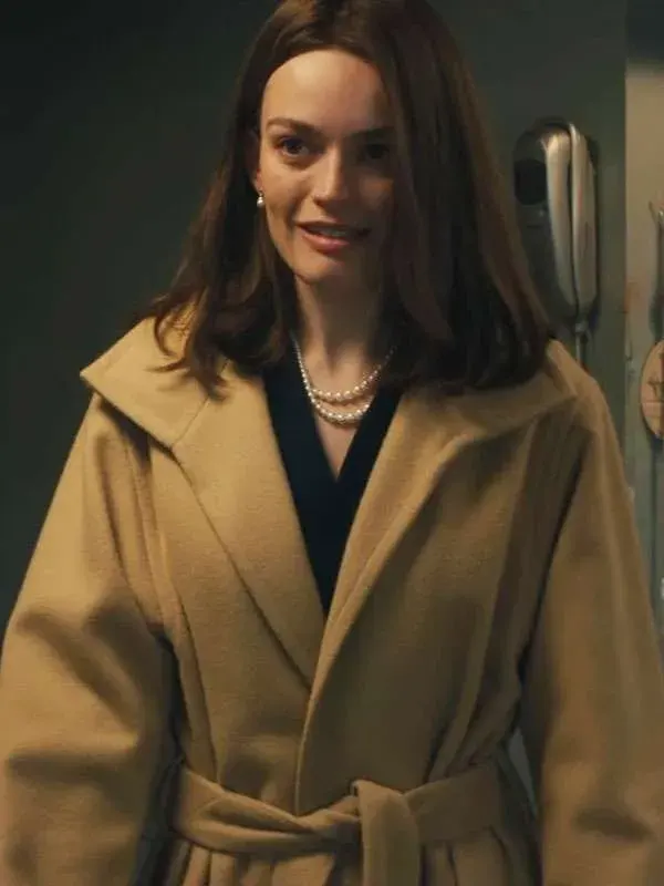 Ella McCay, played by Emma Mackey, navigates ambition and secrets in a charming British drama. Ella McCay explores love, ambition, and self-discovery across high society. This brown wool coat, crafted from soft wool blend and lined with viscose, delivers luxurious warmth and structure. Its tailored design with wide lapels and button fastening gives a polished look perfect for business meetings cozy weekends, or refined evening outings.