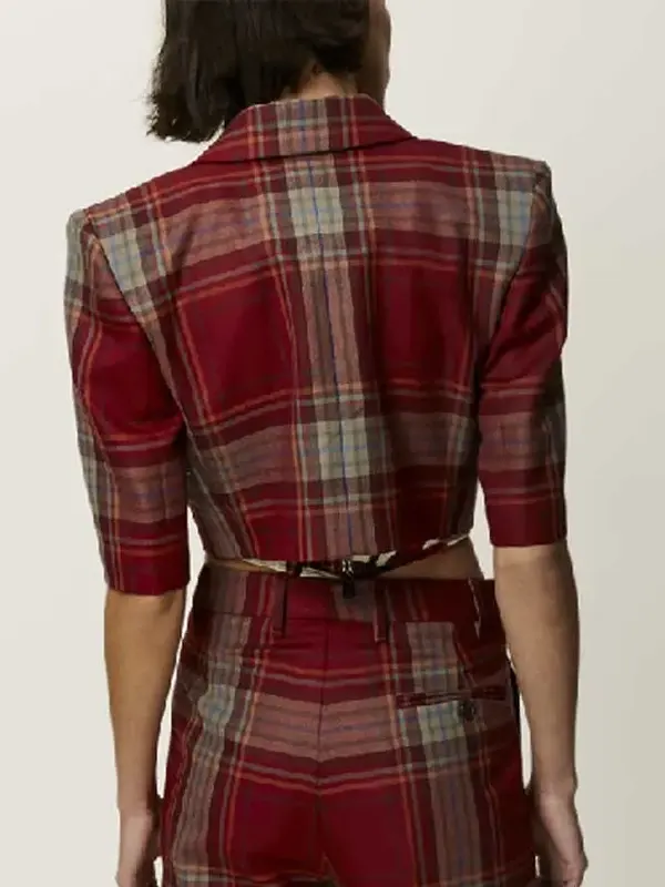 This jacket, styled by Emily Cooper in the Emily in Paris series, features wool fabric, a soft viscose inner, half sleeves, a lapel collar, and button closure in a red plaid pattern with an outside pocket. It is perfect for chic city walks or mild weather outings.