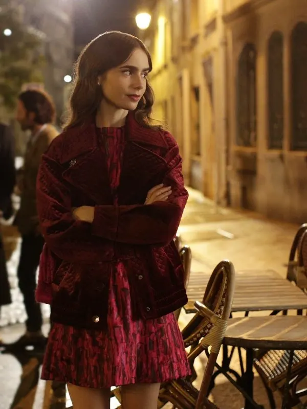 This maroon jacket is worn by Emily Cooper in the series Emily in Paris. It is crafted using velvet fabric and soft viscose lining. It provides smooth comfort with great style. It is perfect for dinner nights, fashion events, indoor parties, travel outings, creative meetups, city gatherings, and everyday elevated looks.