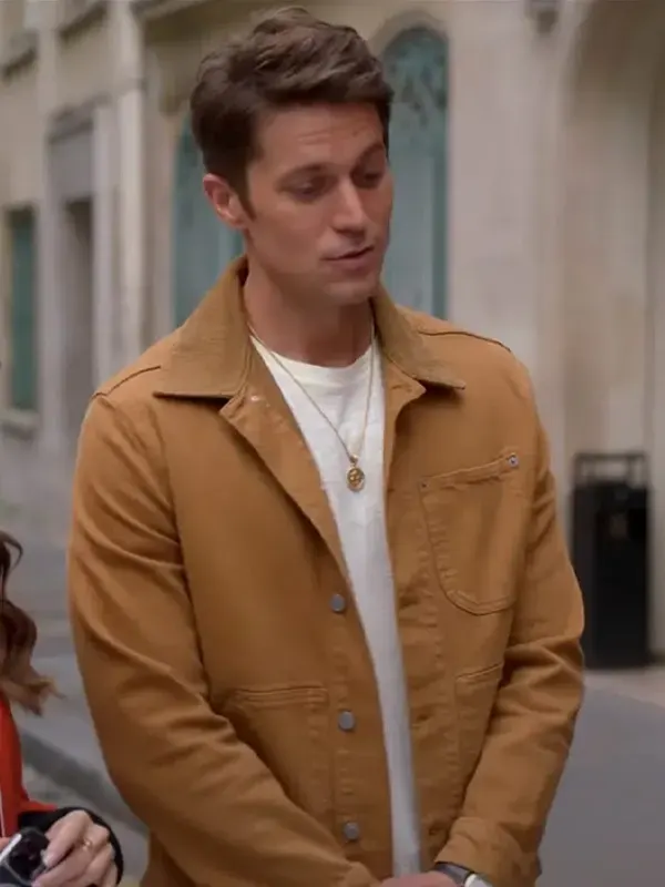 This brown jacket worn by Gabriel in the Emily in Paris series features a cotton exterior, a soft viscose inner, full sleeves, a shirt collar, a button closure, three outside pockets, and one inside pocket. It is perfect for everyday smart casual wear and for improving your winter fashion.