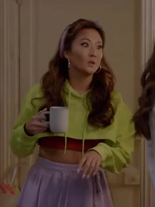 This hoodie worn by Mindy Chen in Emily in Paris features fleece fabric, viscose lining, a pullover closure, ribbed cuffs, and a hooded collar. It is perfect for relaxed casual styling, everyday comfort, outings with friends, and cozy indoor or outdoor moments.