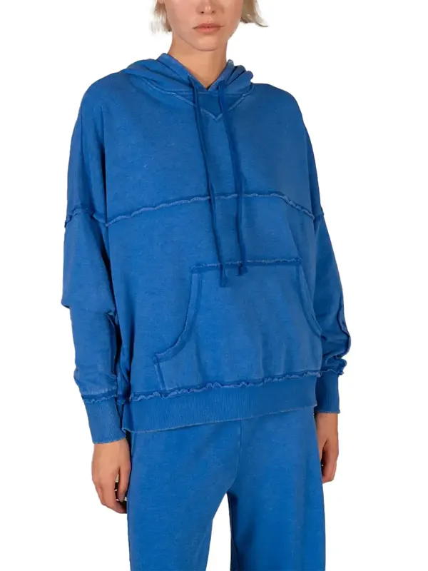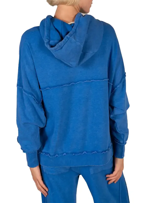 Worn by Jenny Marrs in the Fixer to Fabulous series, this blue hoodie features fleece fabric, soft viscose lining, full length sleeves, ribbed cuffs, a hooded collar with strings, a pullover closure, and two outside pockets. It works well for daily comfort and relaxed outings.