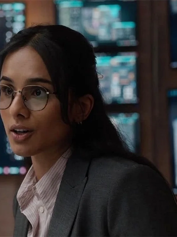 This grey blazer worn by Aparna Brielle in the FUBAR TV series boasts a tailored suiting fabric construction with a refined grey hue. The blazer features a lapel collar, button front closure, full length sleeves, viscose inner lining for comfort, and two external plus one internal pocket.