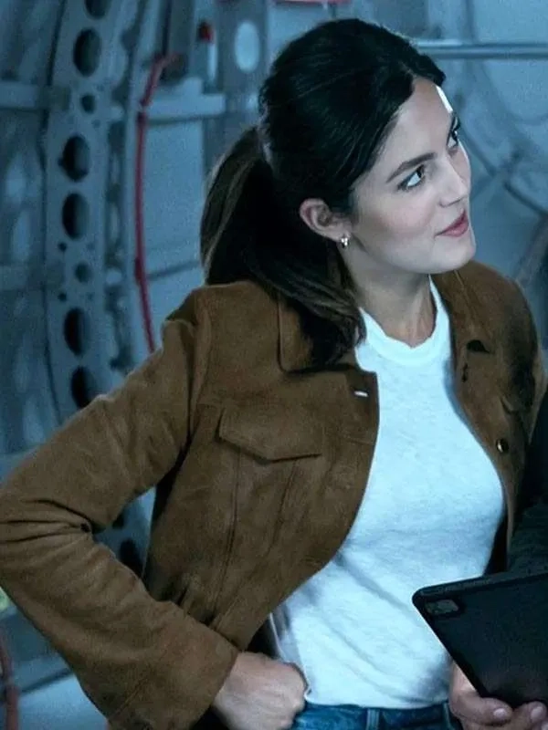 This brown jacket worn by Emma Brunner in FUBAR delivers a warm, refined tone through its suede leather finish. With a soft viscose interior, button front, shirt style collar, buttoned cuffs, and generous pockets, it balances comfort and sophistication in a screen inspired wardrobe piece.
