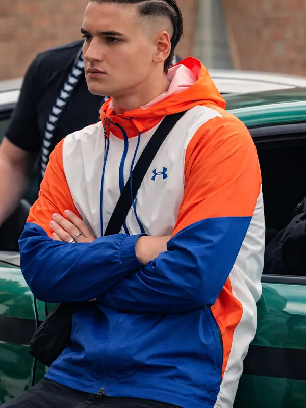 Worn by Will McDonald in the Heartbreak High series, this Multicolor jacket features polyester fabric, soft viscose lining, full length sleeves, open hem cuffs, hooded style collar, and zipper closure, including two outside pockets and one inside pocket. It is ideal for street style and everyday comfort.