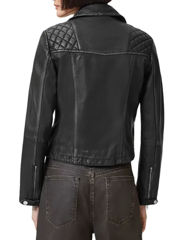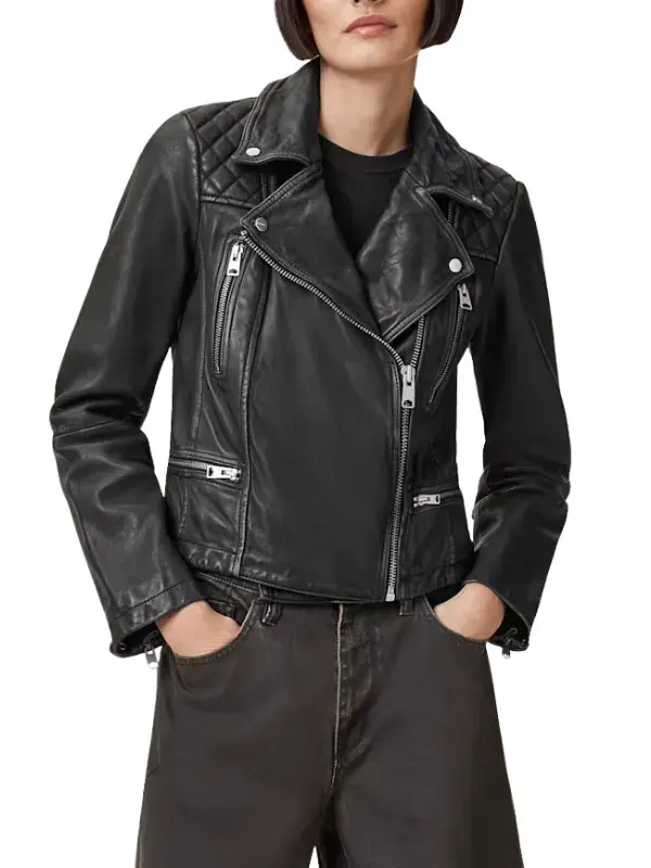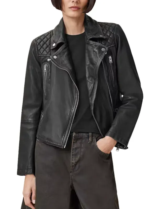 Styled by Greta in How To Get To Heaven From Belfast series, this black jacket is tailored using genuine leather, smooth viscose lining, full length sleeves, zipper cuffs, lapel style collar, and zipper closure with four outside pockets and two inside pockets. It complements rugged looks and confident outfits.