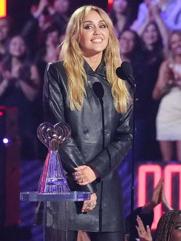 Inspired by Miley Cyrus recent appearance at the iHeartRadio Music Awards, this black coat is made using genuine leather, soft viscose inner, full length sleeves, open hem cuffs, shirt style collar, and button closure, including two outside pockets and two inside pockets. It fits bold styling, events, and high fashion looks.
