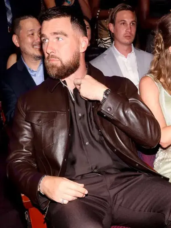 Styled by Travis Kelce at the iHeartRadio Music Awards, this brown jacket is tailored using genuine leather, soft viscose inner, full length sleeves, buttoned cuffs, shirt style collar, and button closure, including four outside pockets and two inside pockets. It fits casual styling, outings, and modern everyday fashion.