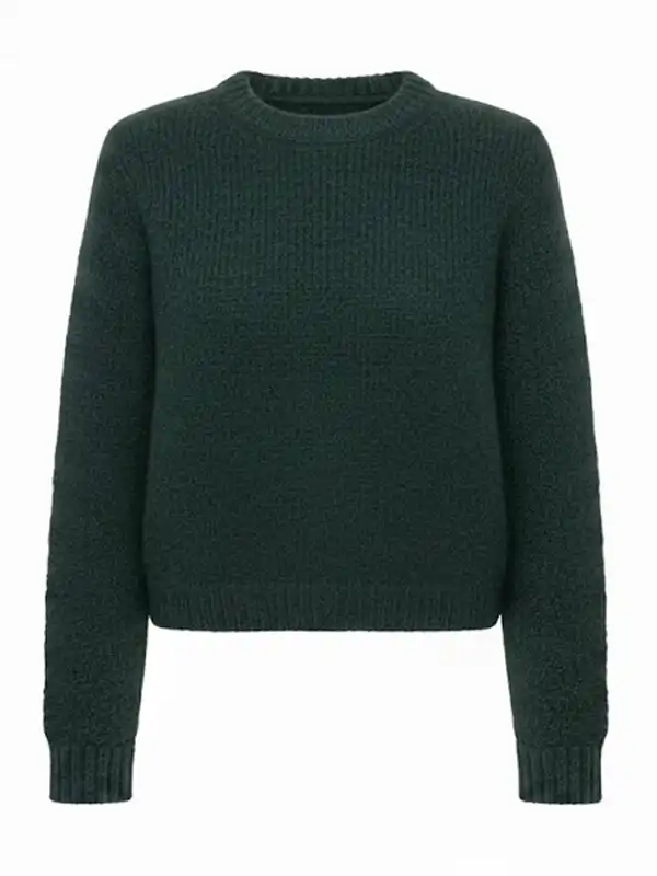 This green sweater styled by Ronnie Grogan in the TV series IT Welcome to Derry offers warm wool comfort with a soft viscose interior. Its pullover design, ribbed cuffs, and round neck give it a relaxed, familiar feel that suits calm weather and easygoing outfits.