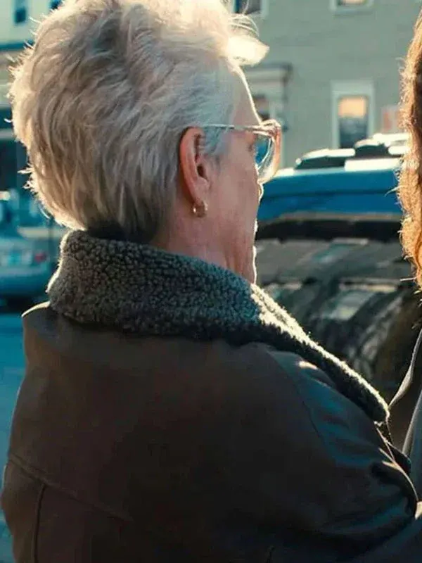 This coat, styled by Jamie Lee Curtis in the movie Ella McCay, features a genuine leather exterior, shearling lining, button belted closure, shearling cuffs and collar, and multiple pockets. It is great for improving your everyday outdoor winter style.