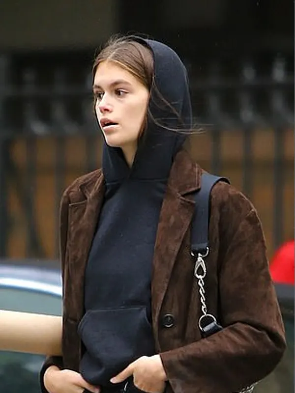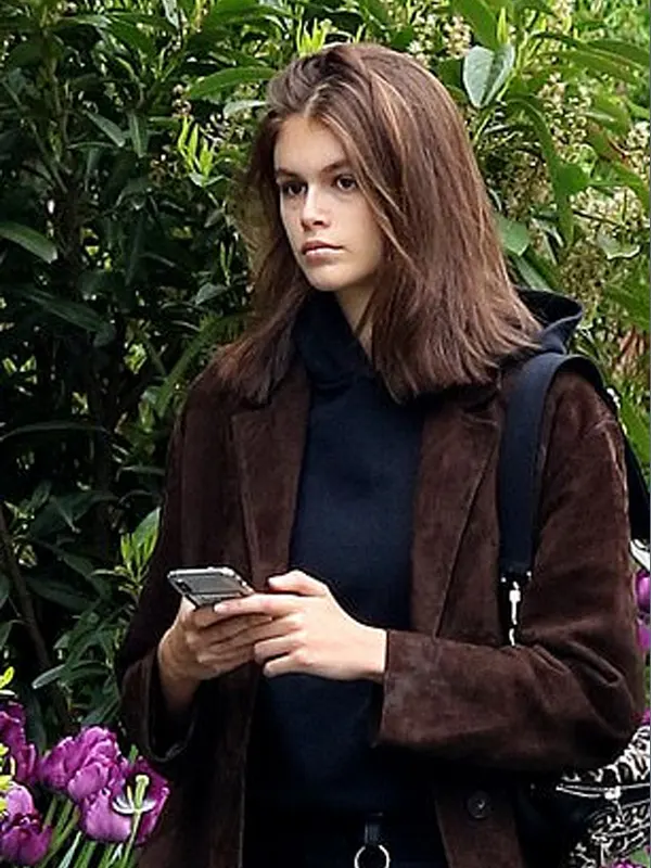 Kaia Gerber’s cropped black biker jacket channels her sleek, fearless style with a rock‑chic edge. Crafted from genuine leather and lined with soft viscose, it has an asymmetrical zipper, zip cuffs, and roomy pockets. The short cut gives freedom of movement and pairs effortlessly with high‑waisted jeans or evening wear.