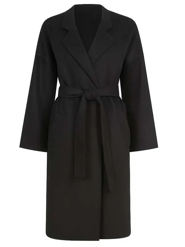 This sleek black coat worn by Kendall Jenner at her NYC outdoor appearance is built using wool fabric, smooth viscose lining, full length sleeves, open hem cuffs, lapel style collar, and belted closure with two outside pockets and two inside pockets. It enhances modern street fashion and elegant daily wear.