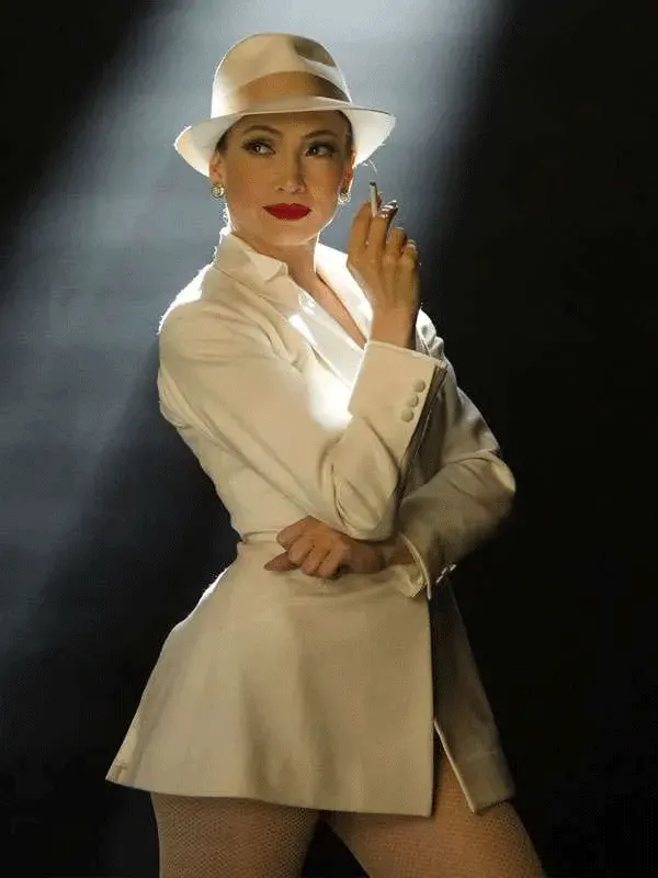 A polished white blazer inspired by Jennifer Lopez in the Kiss of the Spider Woman movie, it features suiting fabric and soft viscose lining, a lapel collar, button closure, full sleeves, buttoned cuffs, and multiple pockets that enhance its clean silhouette. Perfect for formal gatherings or upscale modern styling.