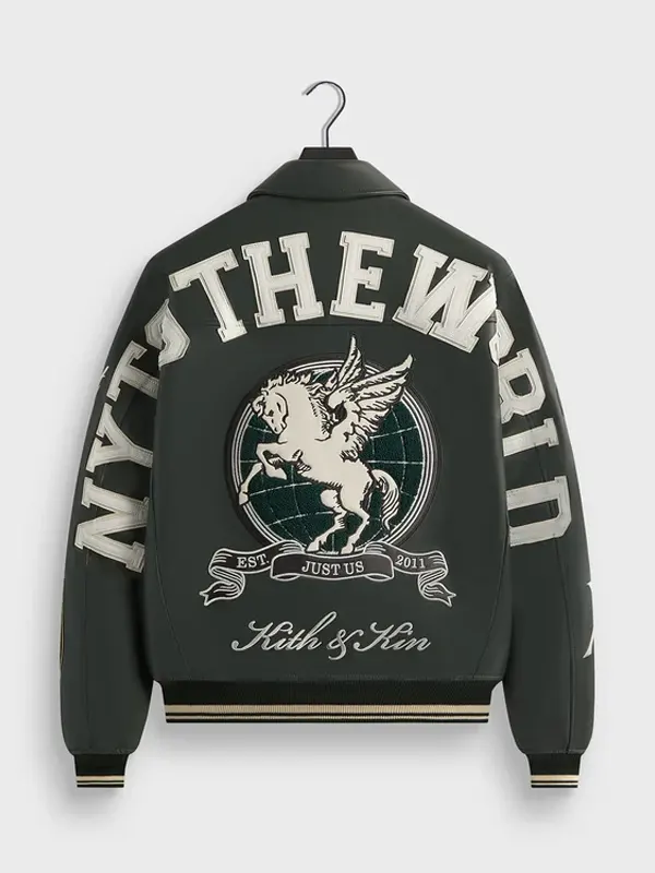 Designed with classic varsity charm, this Kith Dark Green Leather Varsity Jacket features genuine leather, soft viscose inner, full length sleeves, ribbed cuffs, shirt style collar, and button closure, including two outside pockets and two inside pockets. It fits casual meetups, weekend wear, and everyday fashion styling.