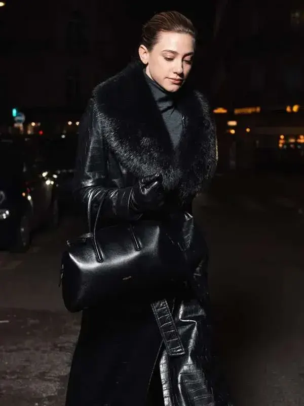 American Actress Lili Reinhart Street Style 2026 Black Leather Trench Long Coat