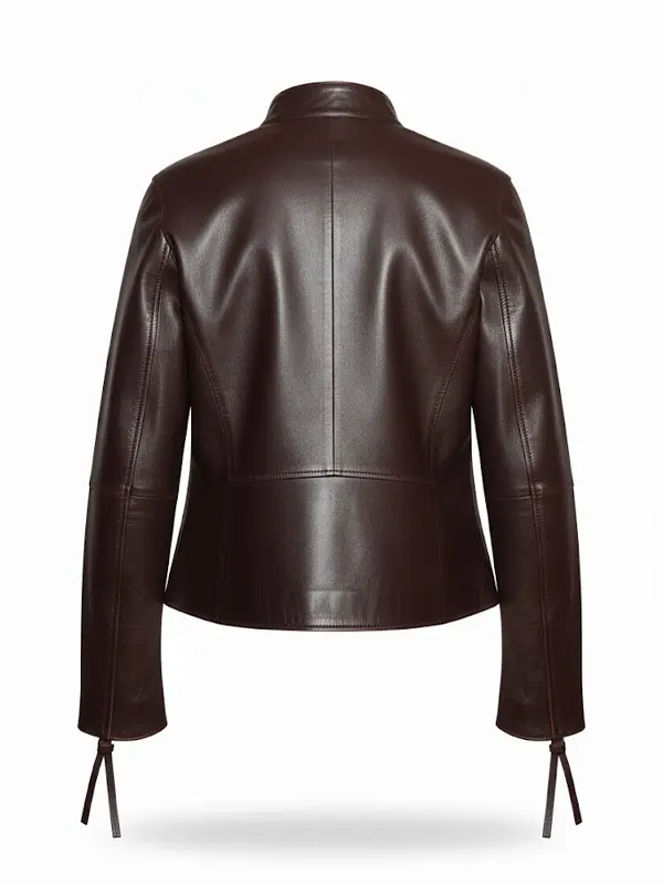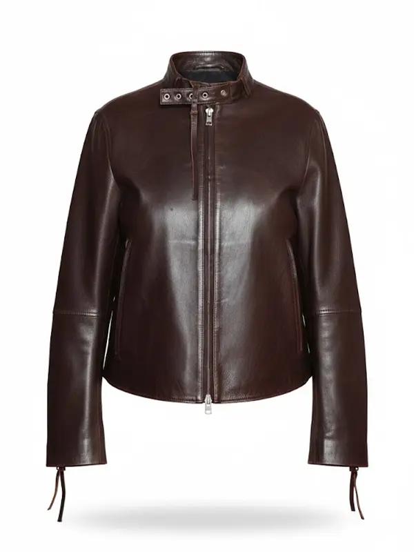 This Maroon Leather Jacket captures pop icon Charli XCX’s daring energy at London Fashion Week. It features rich maroon leather, a erect style collar with buckle, full sleeves, zipper cuffs, and multiple pockets, marrying edgy celebrity style with finely crafted leatherwork.