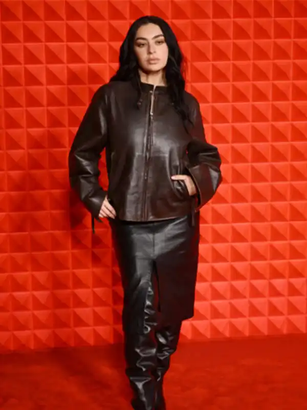 British Singer Charli XCX London Fashion Week 2025 Maroon Leather Jacket