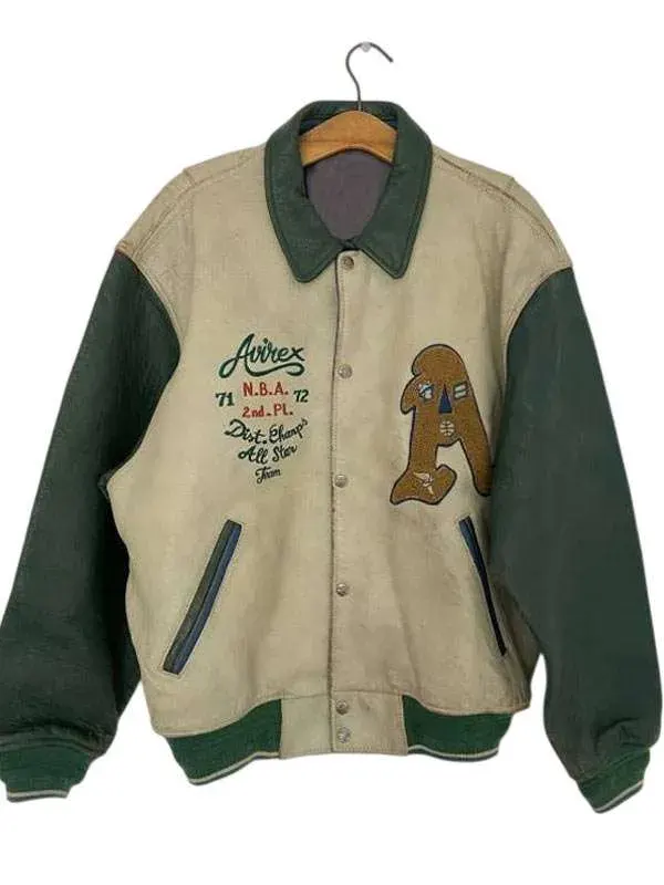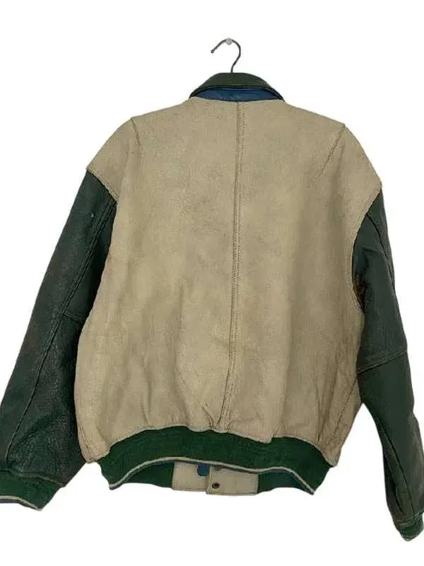Worn by Konnor Ewudzi in Love Island UK All Stars series, this beige and green varsity jacket is crafted using genuine leather, soft viscose lining, full length sleeves, ribbed cuffs, shirt style collar, and button closure, featuring two outside pockets and two inside pockets. It suits casual fashion.