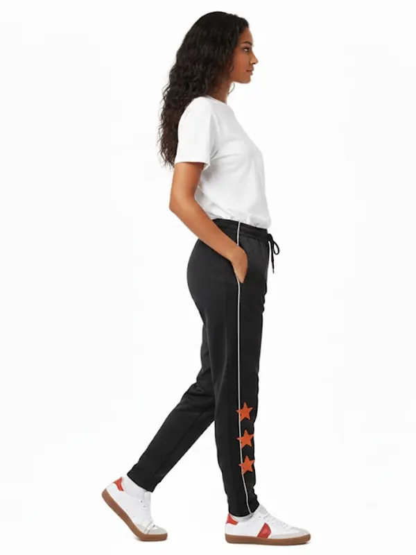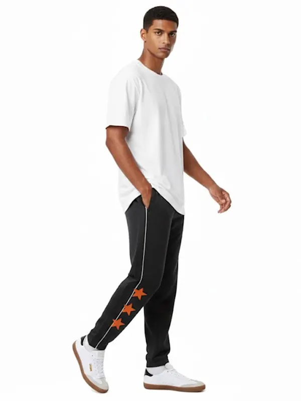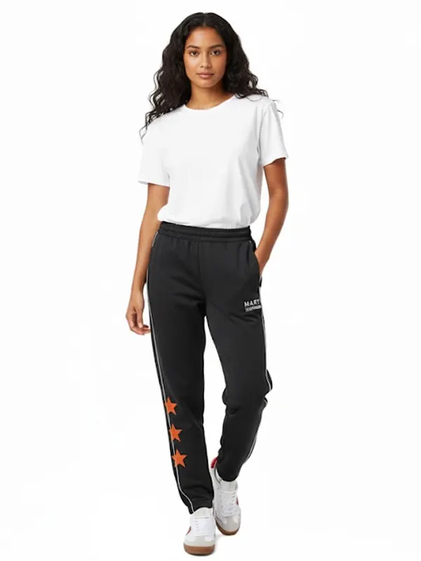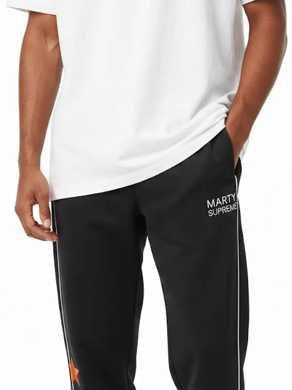 Make a bold statement with these Marty Supreme A24 Black Track Touser. Designed for both comfort and style, they feature vertical white piping and three vibrant orange stars on the leg. The elastic cuffs and premium fabric ensure a perfect fit, making them an essential addition to any modern streetwear wardrobe.