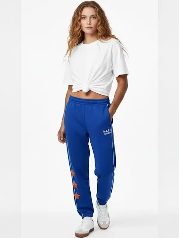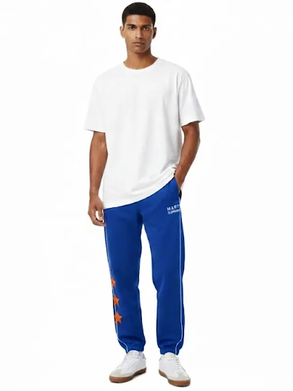 Stand out in the Marty Supreme A24 Electric Blue Track Trouser. This vibrant pair features contrasting white piping and three signature orange stars on the leg for a high-energy look. Designed with soft, durable fabric and a relaxed fit, they provide all-day comfort while maintaining a sharp, trend-setting aesthetic for everyone.