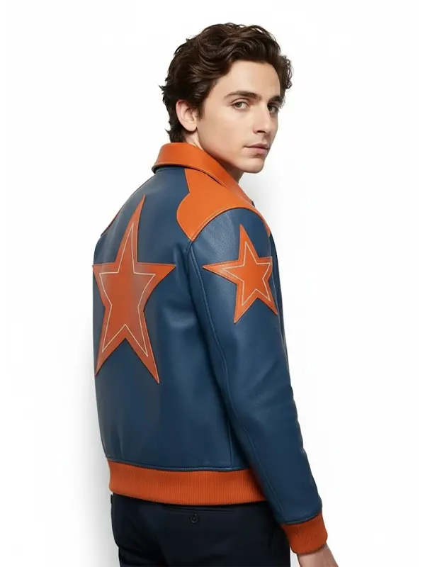This Marty Supreme bomber jacket features an energetic orange and navy blue color-blocked design. The front includes the “MARTY SUPREME” logo, while the back showcases a huge, striking orange star. With ribbed trims and a classic collar, this leather jacket offers a bold, retro-inspired aesthetic perfect for standing out.