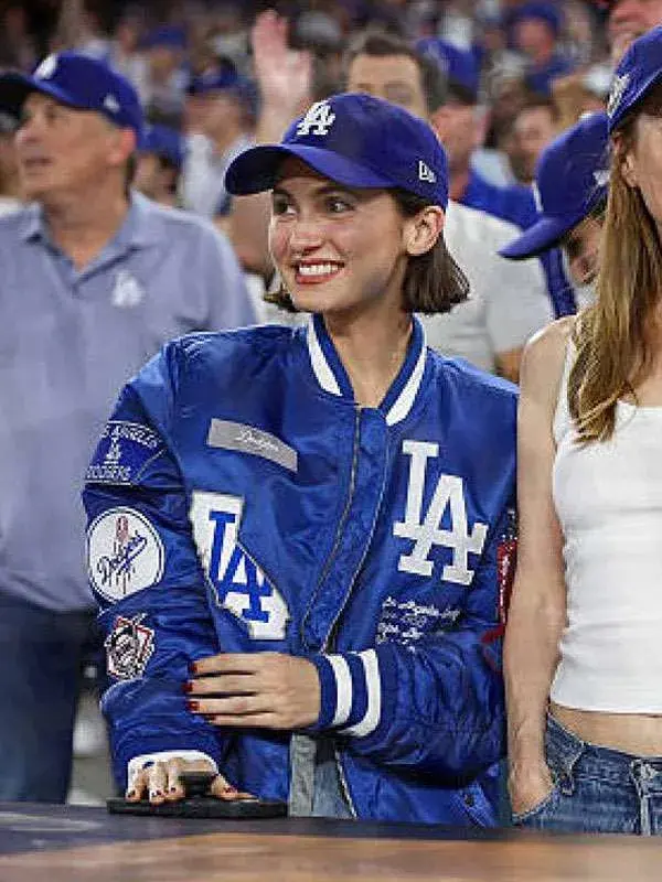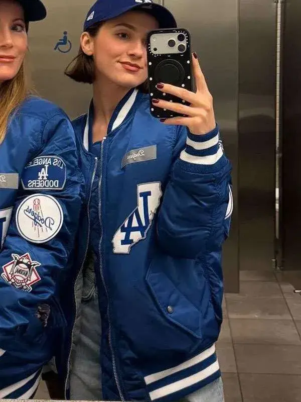 This Maude Apatow LA Dodgers Varsity Jacket offers satin fabric shine, soft viscose lining, full length sleeves, ribbed cuffs, rib knit collar, and zipper closure, including two outside pockets and two inside pockets. It works well for relaxed outings, sporty fashion moments, and youthful everyday wardrobe combinations.