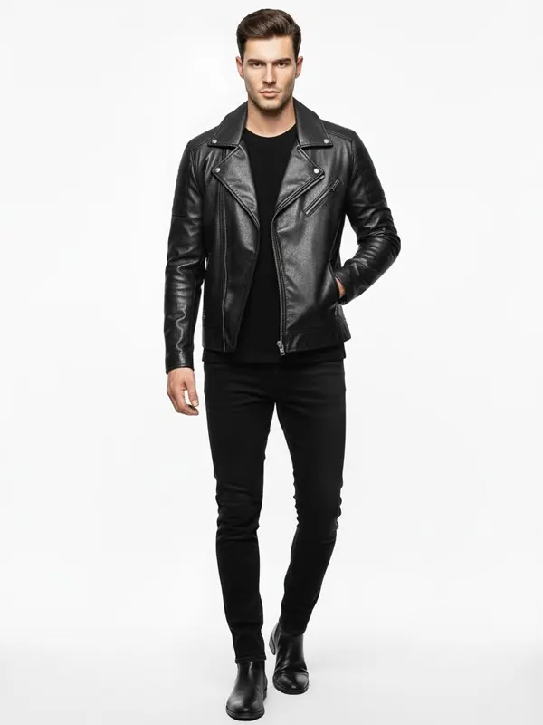 This jacket delivers authentic motorcycle biker style in premium black leather. It features a durable exterior, smooth inner lining, zippered front, reinforced stitching, and functional pockets for practicality. It is perfect for riding, casual outings, and anyone wanting a bold, protective, and confidently masculine leather biker jacket.
