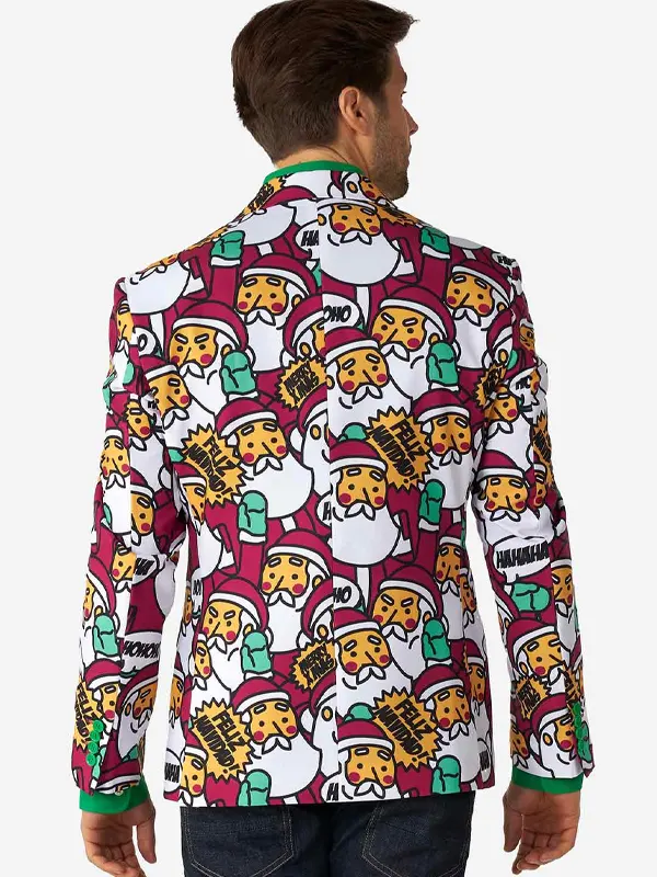 This Men’s Christmas Cool Claus blazer offers a festive, yet refined look. Made from high‑quality polyester twill, it features notch lapels, padded shoulders, a fully lined interior, a slim fit, and a classic two button front. Perfect for stylish holiday gatherings.