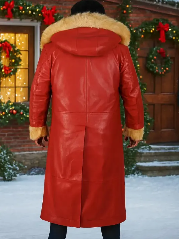 This men’s Christmas hooded red leather coat features genuine leather, soft lining, a roomy hood, full sleeves, and a secure open closure perfect for winter warmth. For festive wardrobe ideas, some holiday coat enthusiasts also explore the Santa Claus Shearling Coat to complete their seasonal style.