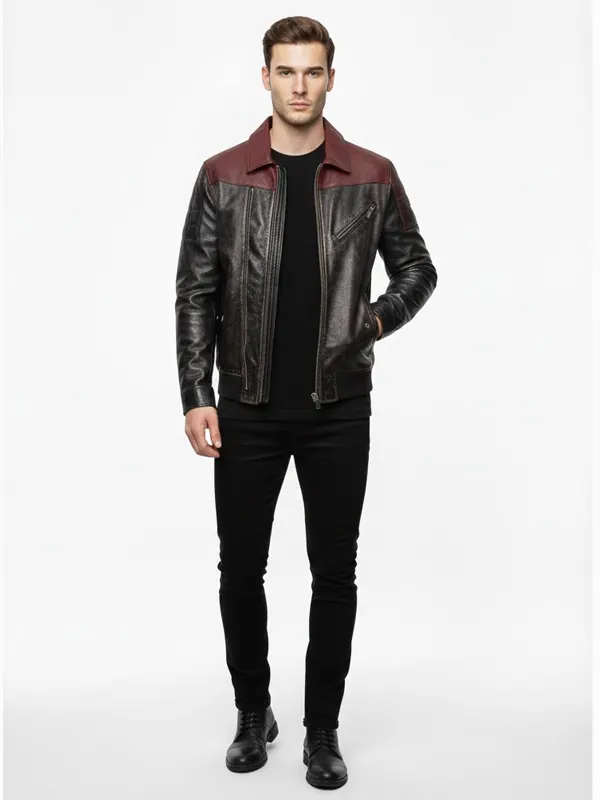 This jacket features a rugged, distressed black leather finish that adds vintage character to classic bomber styling. It includes a smooth inner lining, ribbed cuffs, sturdy zipper closure, and functional pockets. It is perfect for casual wear, travel, and anyone seeking a worn-in, effortlessly cool leather bomber look.