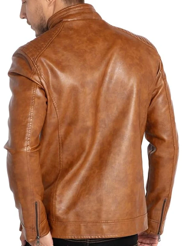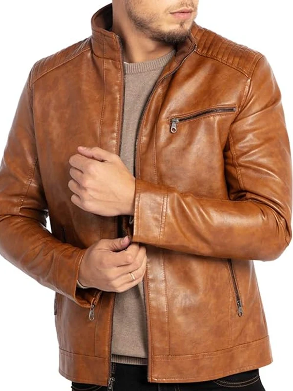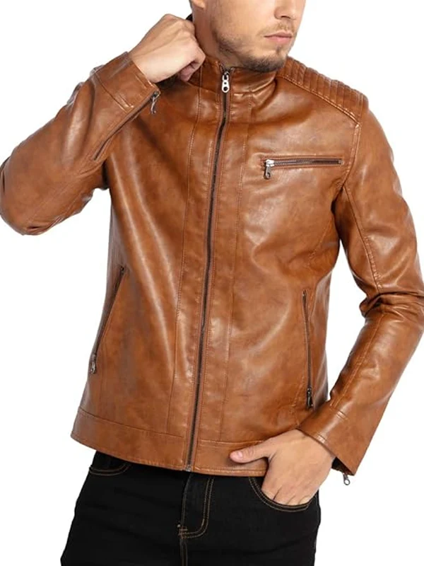 Men’s Motorcycle Stand Collar Lightweight Light Brown Leather Jacket
