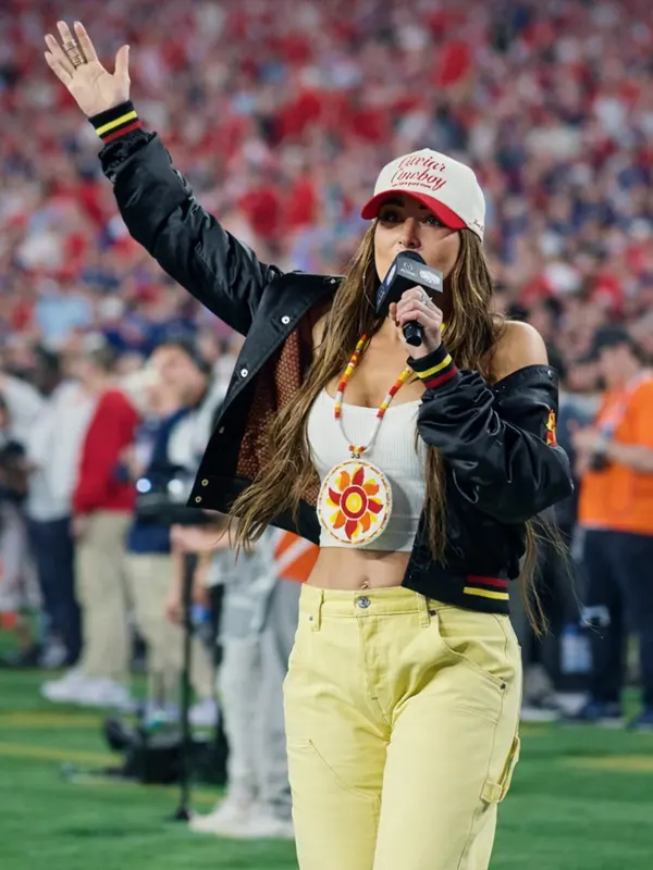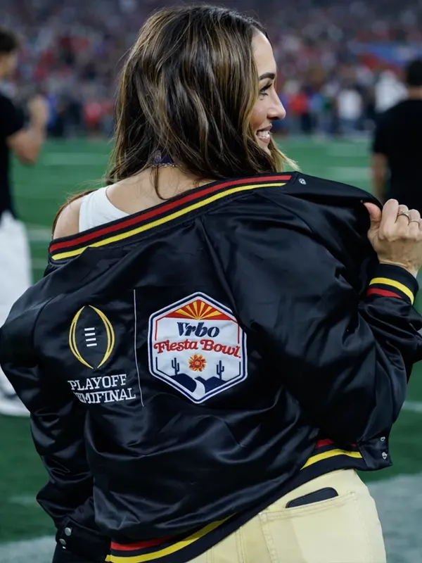 Celebrate in style with this exclusive black satin bomber jacket, worn by Nikki Bella at the Vrbo Fiesta Bowl. It features striking red and yellow striped rib-knit details, a snap-button front, and high-quality “Playoff Semifinal” embroidery on the back. Perfect for sports enthusiasts wanting a bold, athletic, and celebrity-inspired look.