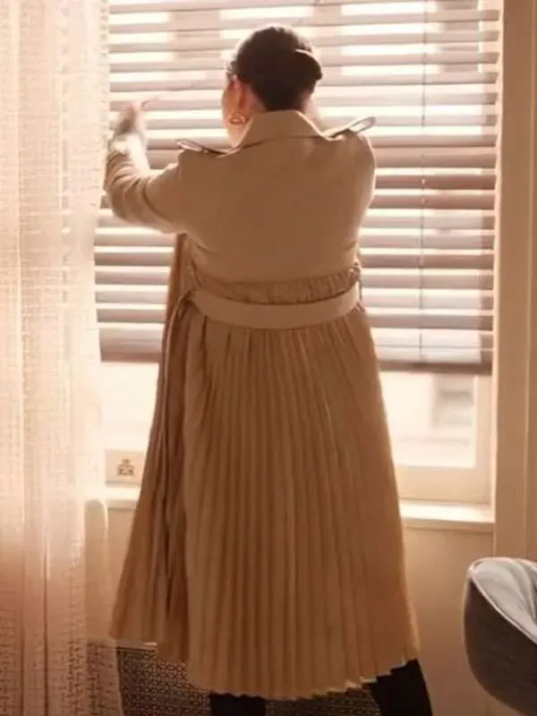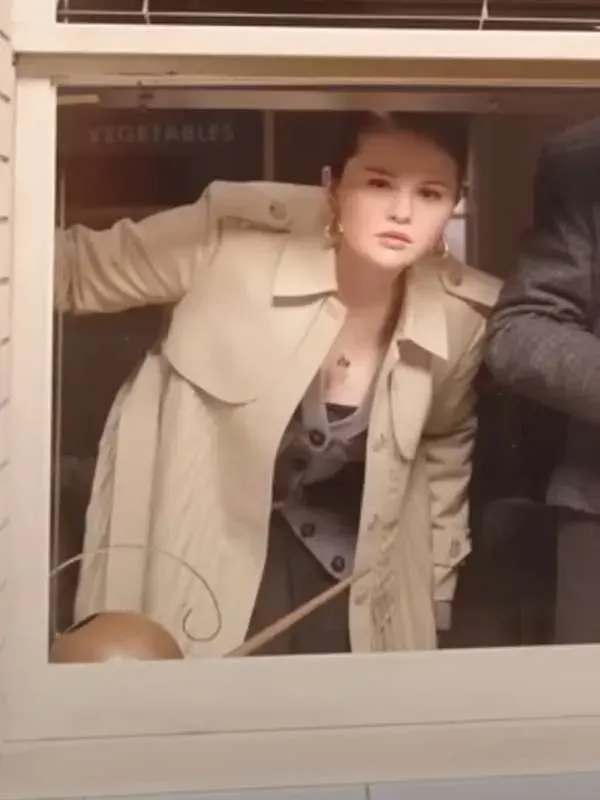 Selena Gomez plays Mabel Mora, a clever amateur sleuth hosting a true‑crime podcast. In Only Murders in the Building Season 4, the trio digs deeper into a new high‑stakes mystery. This beige trench coat is crafted from cotton and wool with a soft viscose lining. It features long sleeves, a buttoned closure, pleated detail, and roomy pockets. Lightweight yet warm, it’s perfect for stylish daytime wear or moonlit investigations.
