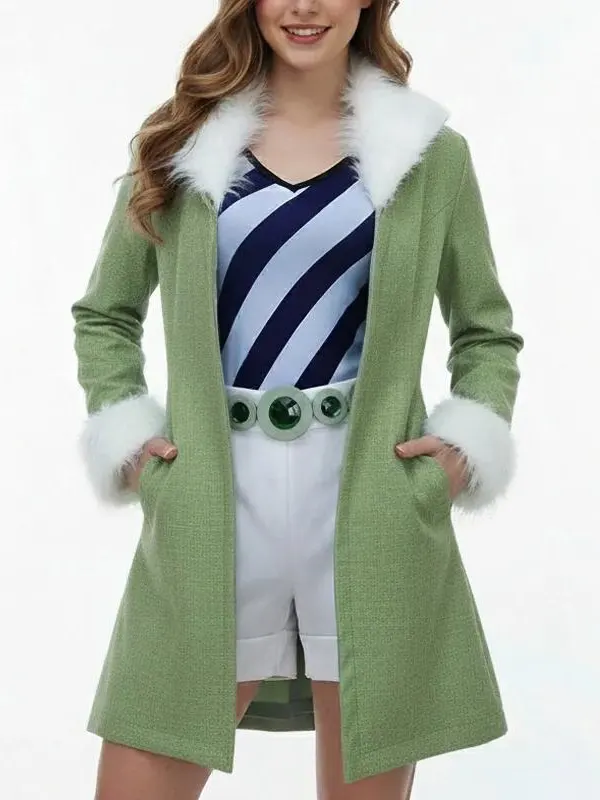 Worn by Miss Wednesday in the One Piece series, this coat is built using cotton polyester with soft viscose lining. Full-length sleeves, fur cuffs and collar, open closure, two outside pockets, and two inside pockets combine comfort and style, perfect for cosplay or casual series-inspired fashion appearances.