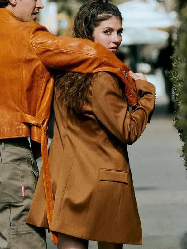This brown coat seen on Emily Bader in the People We Meet on Vacation movie offers wool fabric warmth, smooth viscose lining, full length sleeves, buttoned cuffs, lapel style collar, and button closure, along with three outside pockets and two inside pockets. It is ideal for cozy outings, casual elegance, and seasonal fashion moments.