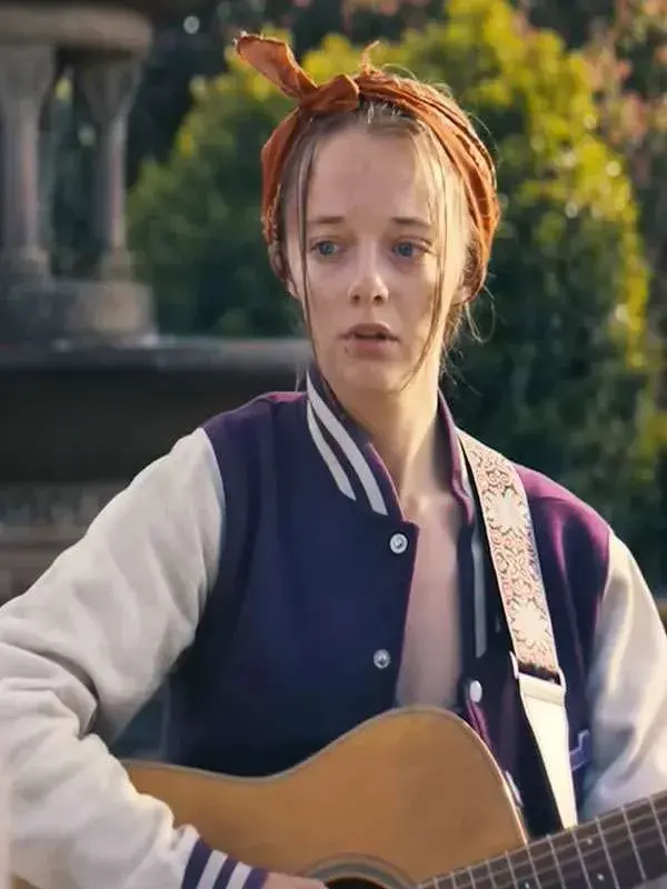 Styled by Paige from the TV series Run Away, this varsity jacket features wool fabric, soft viscose lining, full length sleeves, button closure, ribbed cuffs, a rib knit collar, two outside pockets, two inside pockets, and purple and white color. It is perfect for campus wear and sporty social occasions with a youthful, relaxed, confident style.