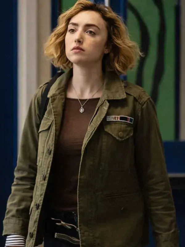 This Maddie Nears Olive Green Jacket from the School Spirits series is made using cotton fabric, soft viscose lining, full length sleeves, buttoned cuff, shirt style collar, and zipper and button front, including four outside pockets and one inside pocket. It complements campus inspired looks.