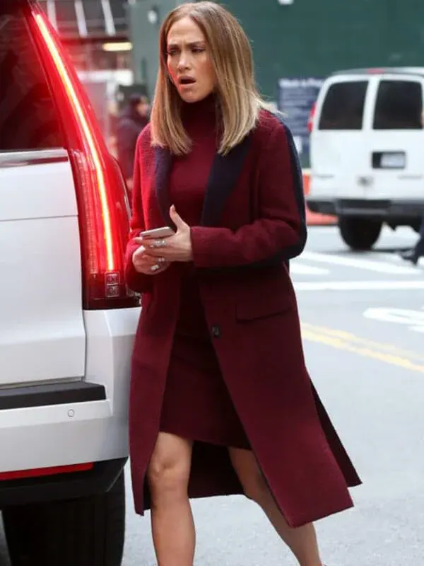 Maya Movie Second Act Jennifer Lopez NYC Maroon Long Wool Coat