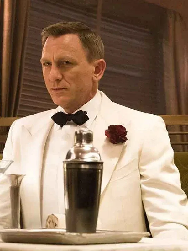Daniel Craig returns as James Bond in Spectre, where the famous spy faces a global threat and his own shadowy past. This iconic Bond film mixes intrigue, action, and romance. This white blazer offers crisp fabric, satin lapels, and a sleek silhouette. Ideal for formal events, black-tie missions, or fans of 007 style.