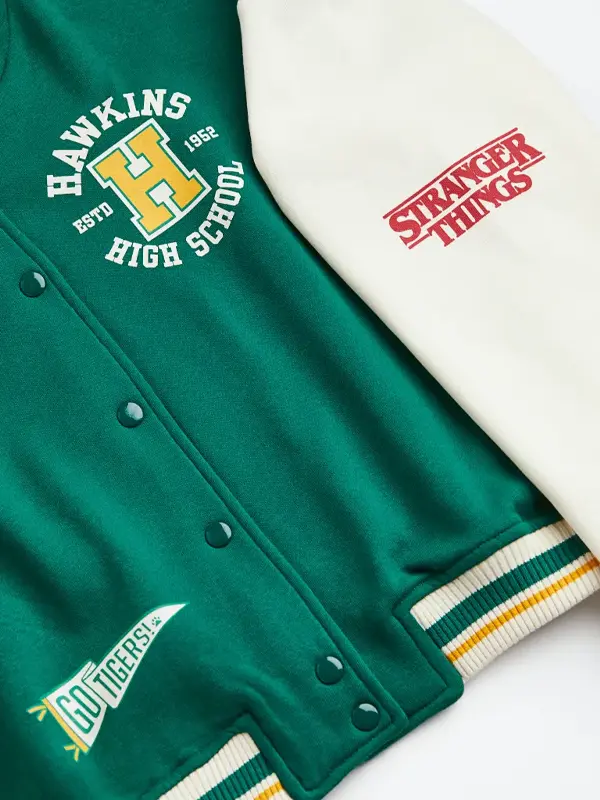 The Stranger Things Women’s Hawkins Tiger Green Varsity Jacket is made using wool fabric, soft viscose lining, full length sleeves, button closure, ribbed cuffs, rib knit collar, one inside pocket, and green and white colors. This jacket works well for casual outings, college wear, themed events, and relaxed street-style moments.