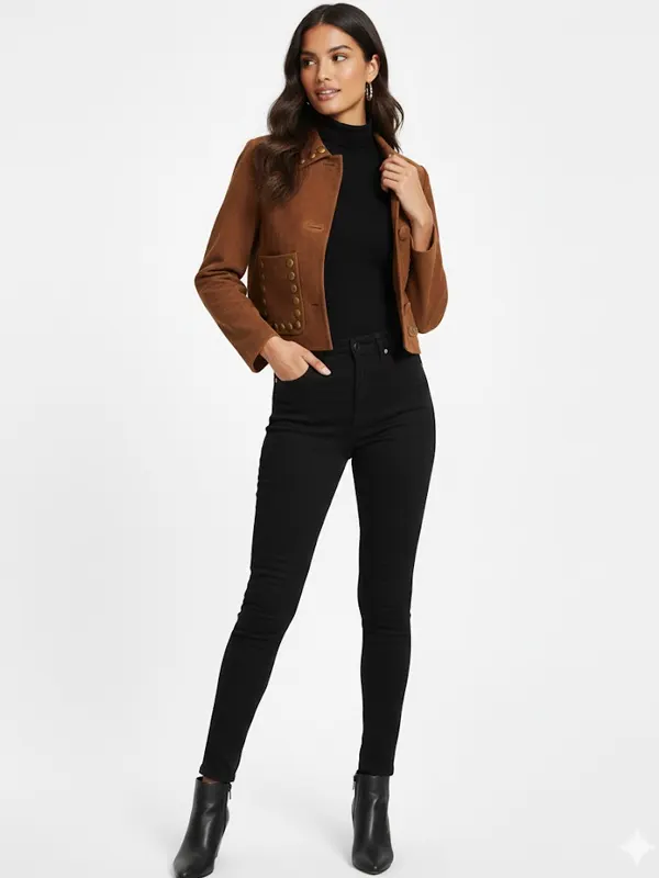 This jacket combines bold attitude with modern cropped styling. Made from soft suede, it features studded detailing, a front zipper closure, smooth inner lining, and a flattering short silhouette. It is perfect for fashion-forward outings, concerts, and anyone seeking an edgy, standout jacket with contemporary flair and confidence.