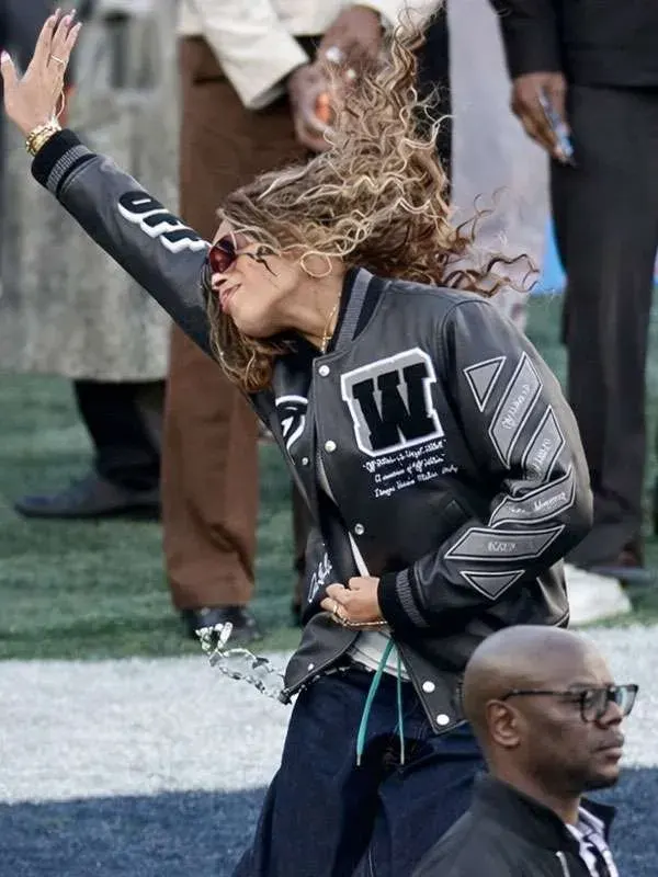 Inspired by Blue Ivy Carter Super Bowl LX appearance, this varsity jacket is crafted using genuine leather, soft viscose lining, full length sleeves, ribbed cuffs, rib knit collar, and button closure, including two outside pockets and two inside pockets. It fits relaxed streetwear and confident everyday fashion.