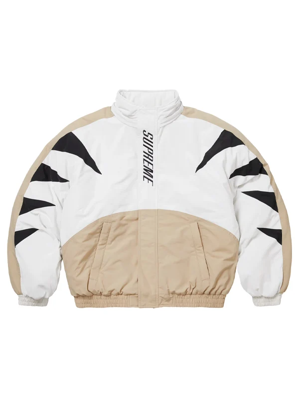 Make a statement with the Supreme Wildcat Sideline Puffer Jacket in vibrant Orange and White/Tan. This high-visibility piece features dynamic tonal claw graphics and a prominent vertical Supreme logo on the chest. Designed with a warm hood and quilted insulation, it is the perfect fusion of style and functionality.