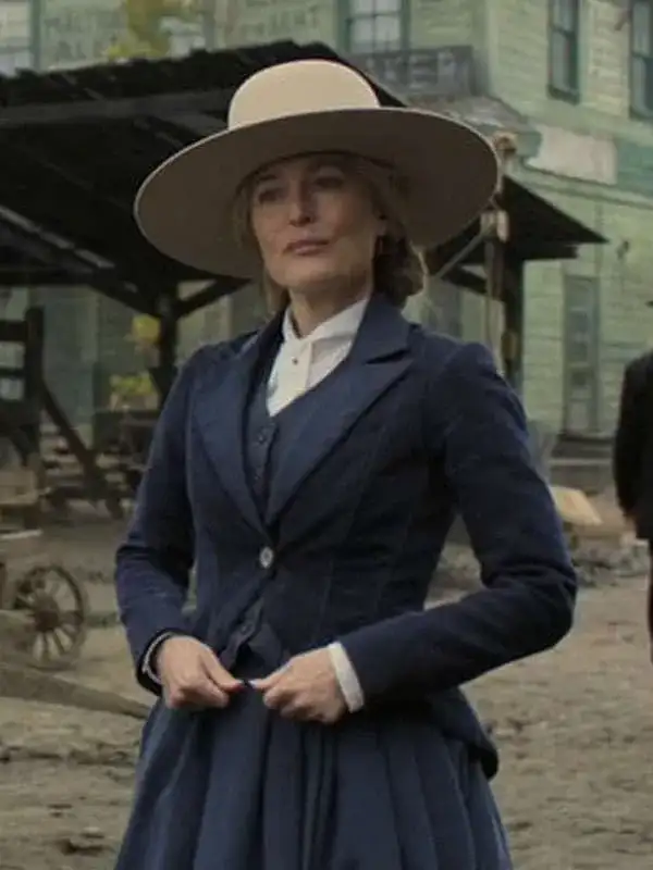 The navy blazer is worn by Constance Van Ness from the series The Abandons, crafted with wool fabric, soft viscose lining, full sleeves, button closure, open hem cuffs, and tidy pockets, presenting refined ease ideal for office routines, dinner plans, social moments, and occasions where balanced sophistication enhances poised presence.