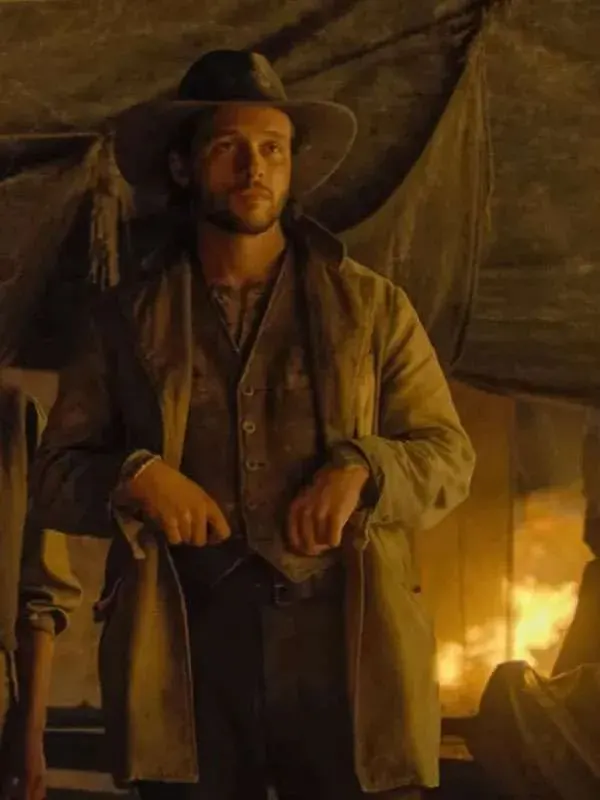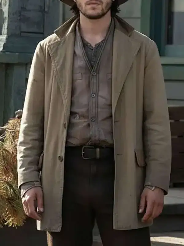This light tan coat is styled by Elias Teller in the series The Abandons, crafted with cotton fabric, soft viscose lining, full sleeves, button closure, buttoned cuffs, and practical pockets, offering calm comfort perfect for daytime errands, social walks, gentle routines, and moments where composed elegance supports a steady presence.